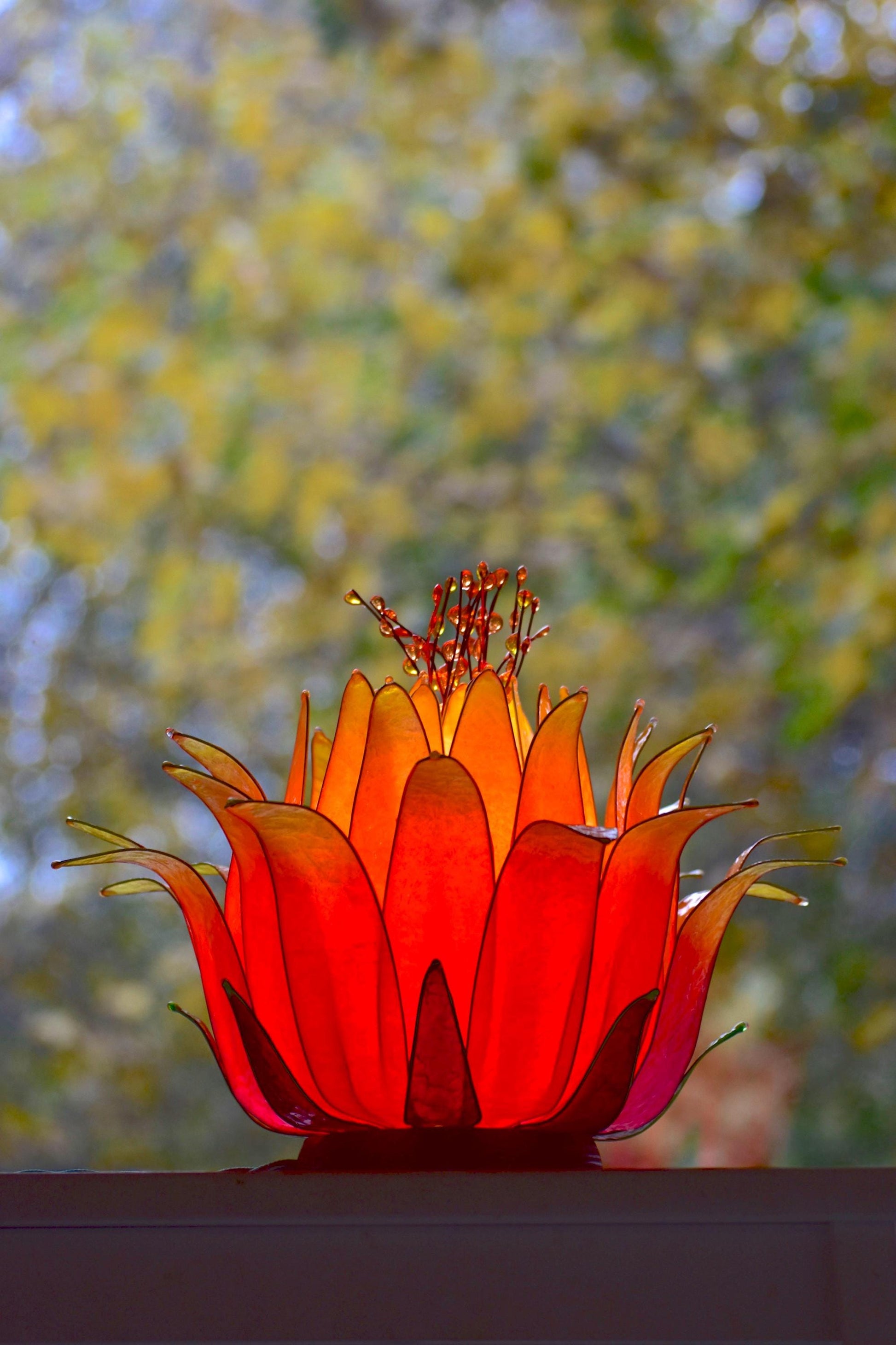 Una fantastica lampada da tavolo arancione con sfumature di rosa in basso, un moderno pezzo unico in resina per un ambiente che esprima pace e tranquillità, un fiore di loto, una decorazione luminosa fatta e dipinta a mano per donare quel tocco in più al tuo ambiente, ideale per una sala di yoga o di preghiera, per un angolo dedicato alla spiritualità o dove conversare allegramente, o per accogliere i tuoi ospiti in uno spa o in un hotel boutique ispirati alla natura!