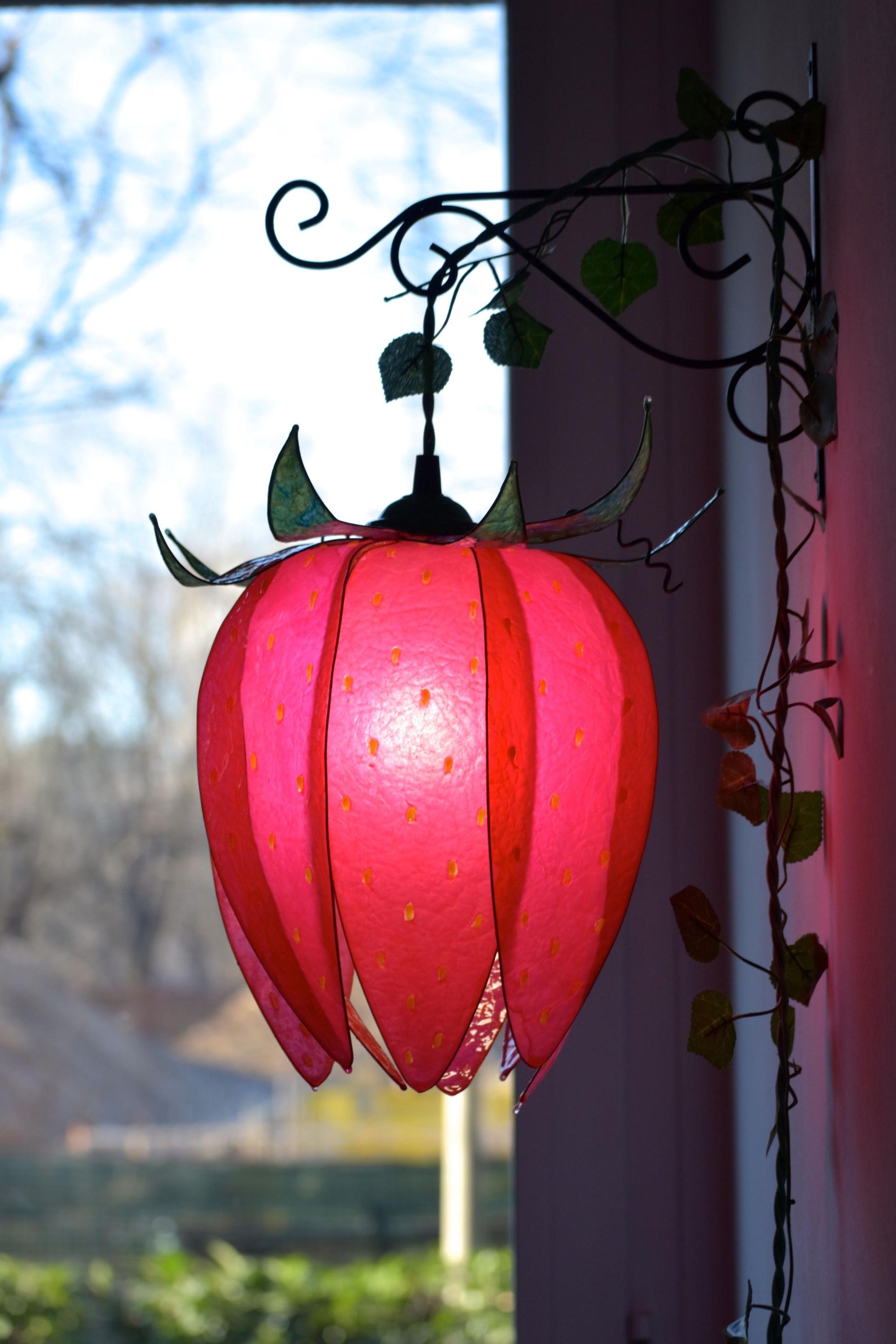 lampada bocciolo di luce a forma di fragola rossa con supporto lavorato in ferro compreso, pezzo unico di illuminazione.