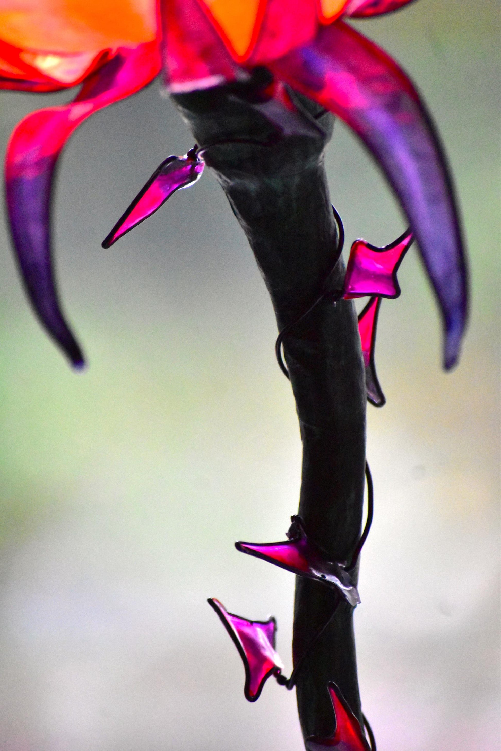 trattata con resina per diventare robusta e resistente e montata su questo stelo leggermente ricurvo che ho costruito sopra una base di legno rotonda dipinta di verde, sul gambo ci sono delle piccole foglioline dipinte di rosso e viola, i pistilli e i motivi fiabeschi che coronano il fiore sono sempre fatti a mano da me con resina in un color viola grigio, cosí come le foglie sotto il fiore.