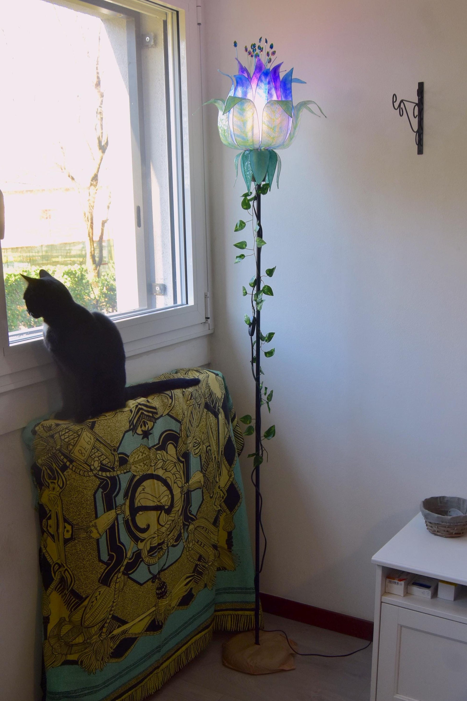 Una nuova lampada da terra a forma di fiore con petali dipinti a mano, mi sono ispirata ai colori delle piume del pavone, toni di blu, verde, fucsia, viola e giallo!! I pistilli blu che coronano il fiore sono sempre fatti a mano in resina cosí come le foglie sotto, le foglie che decorano lo stelo sono artificiali, le potrete trovare molto facilmente del tipo che preferite.