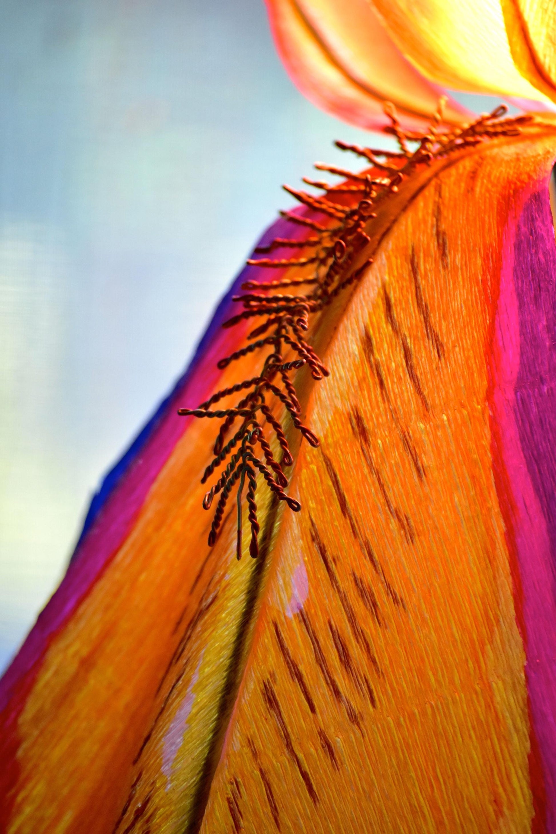 le applico poi su dei telai di filo d'acciaio che ho modellato a mano, ottengo cosí dei petali che monto a forma di fiore di iris su uno stelo nero alto circa 2,10 mt., (se lo volete piú basso sarà sufficiente montare un elemento meno della piantana) il fiore è alto circa 60 cm. per un diametro di circa 38 cm., lo stelo é fornito di interruttore e spina, il portalampada é E27, i cavi elettrici sono 110-240V adatti ai diversi standard internazionali (Europa, America, Australia).
