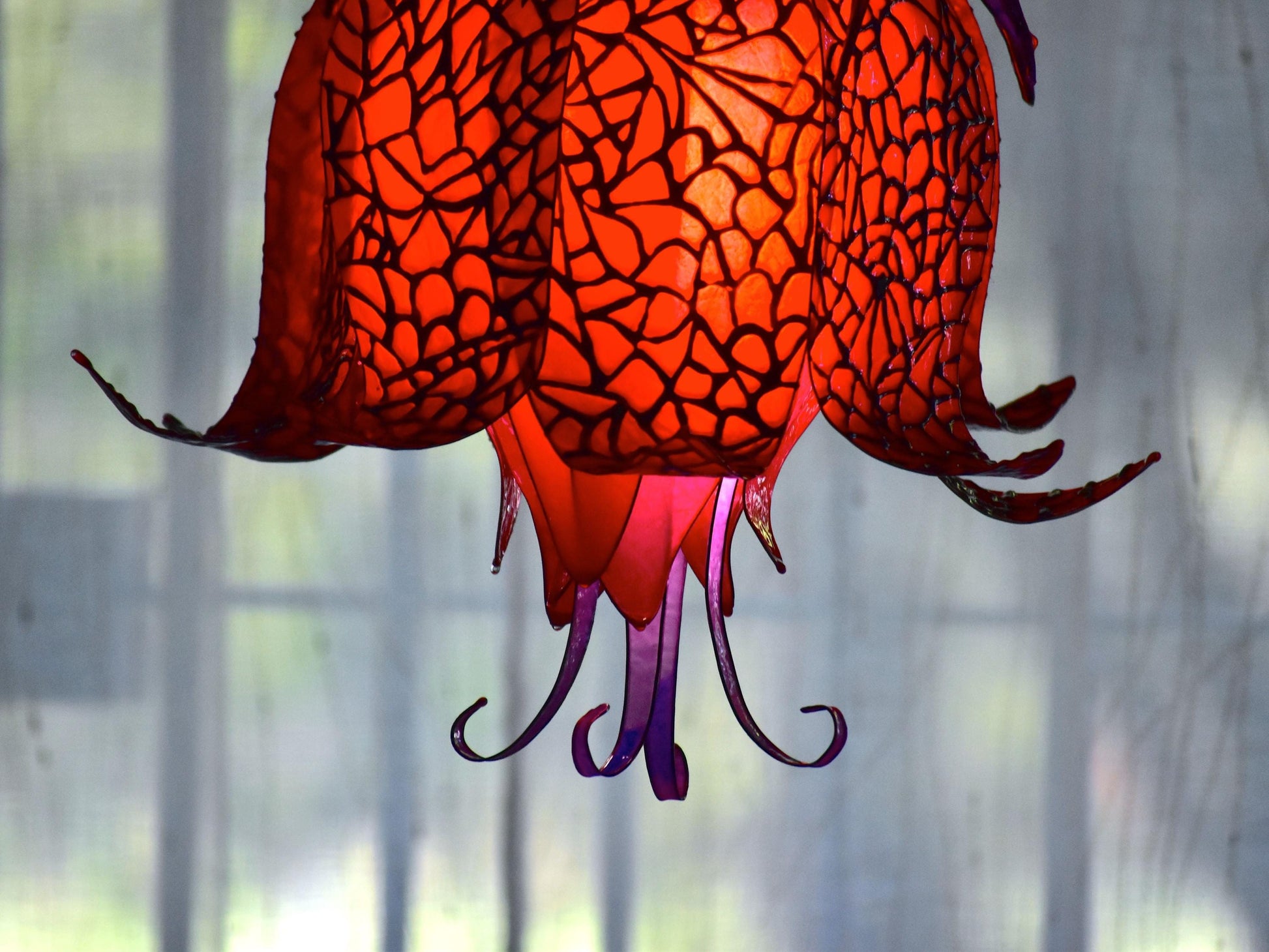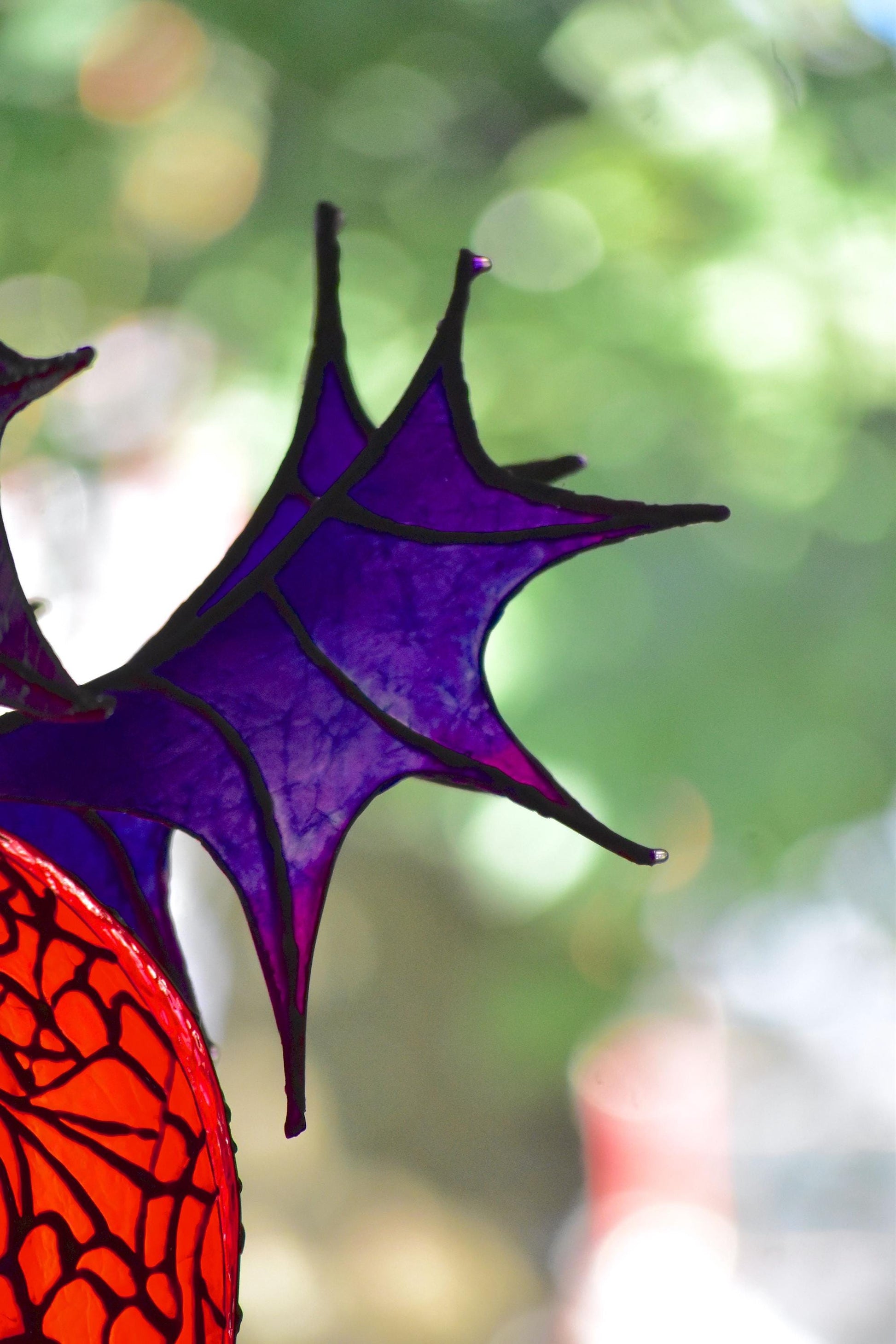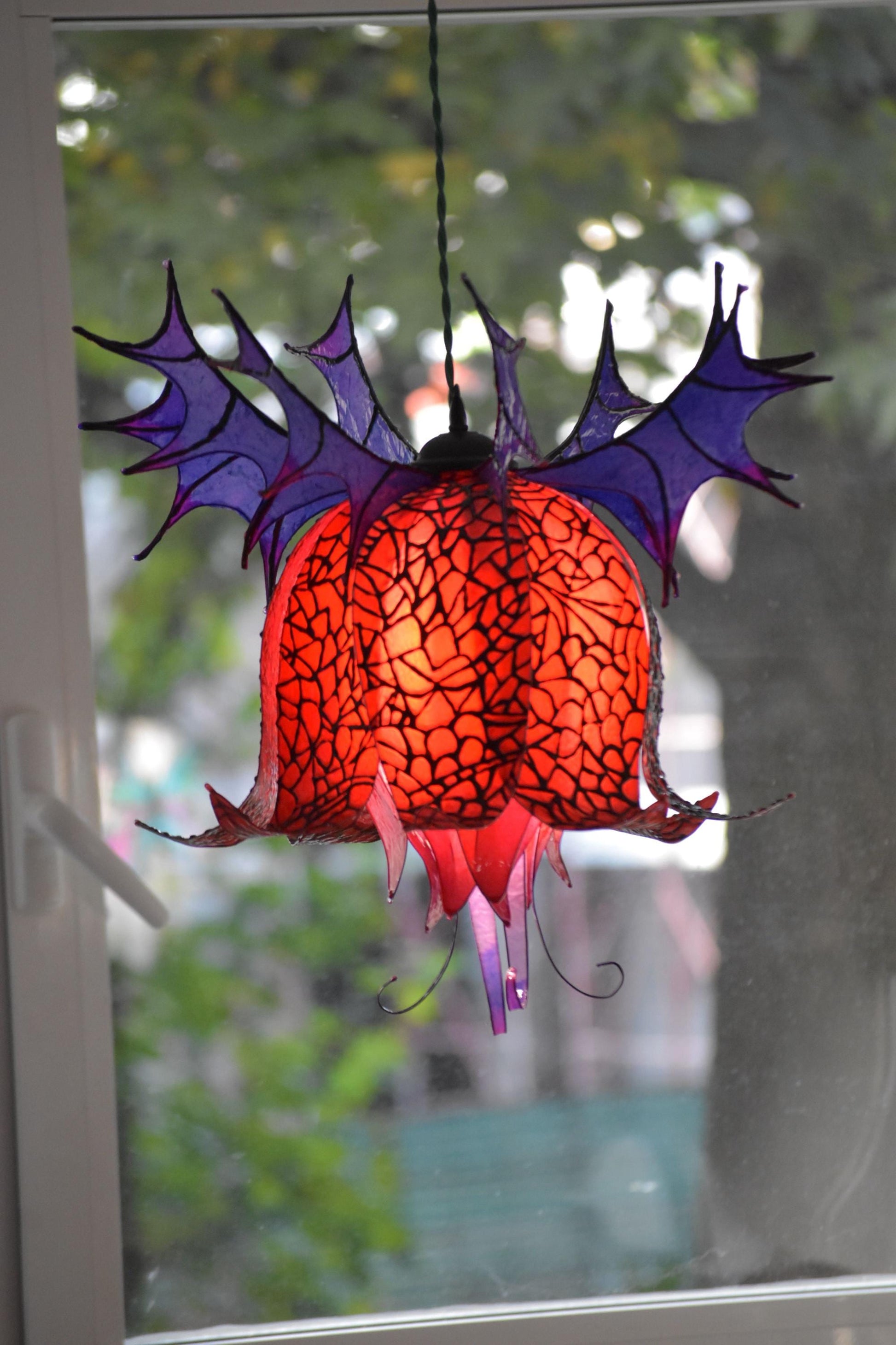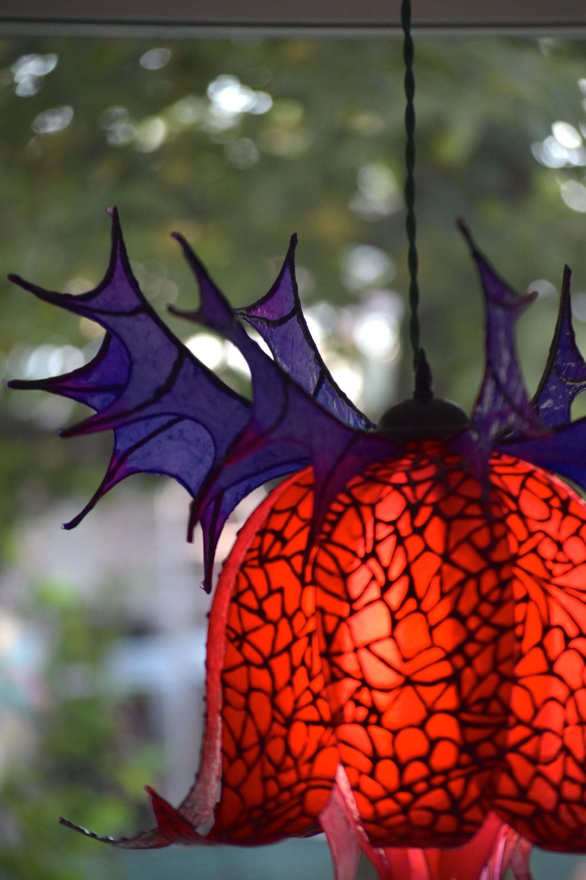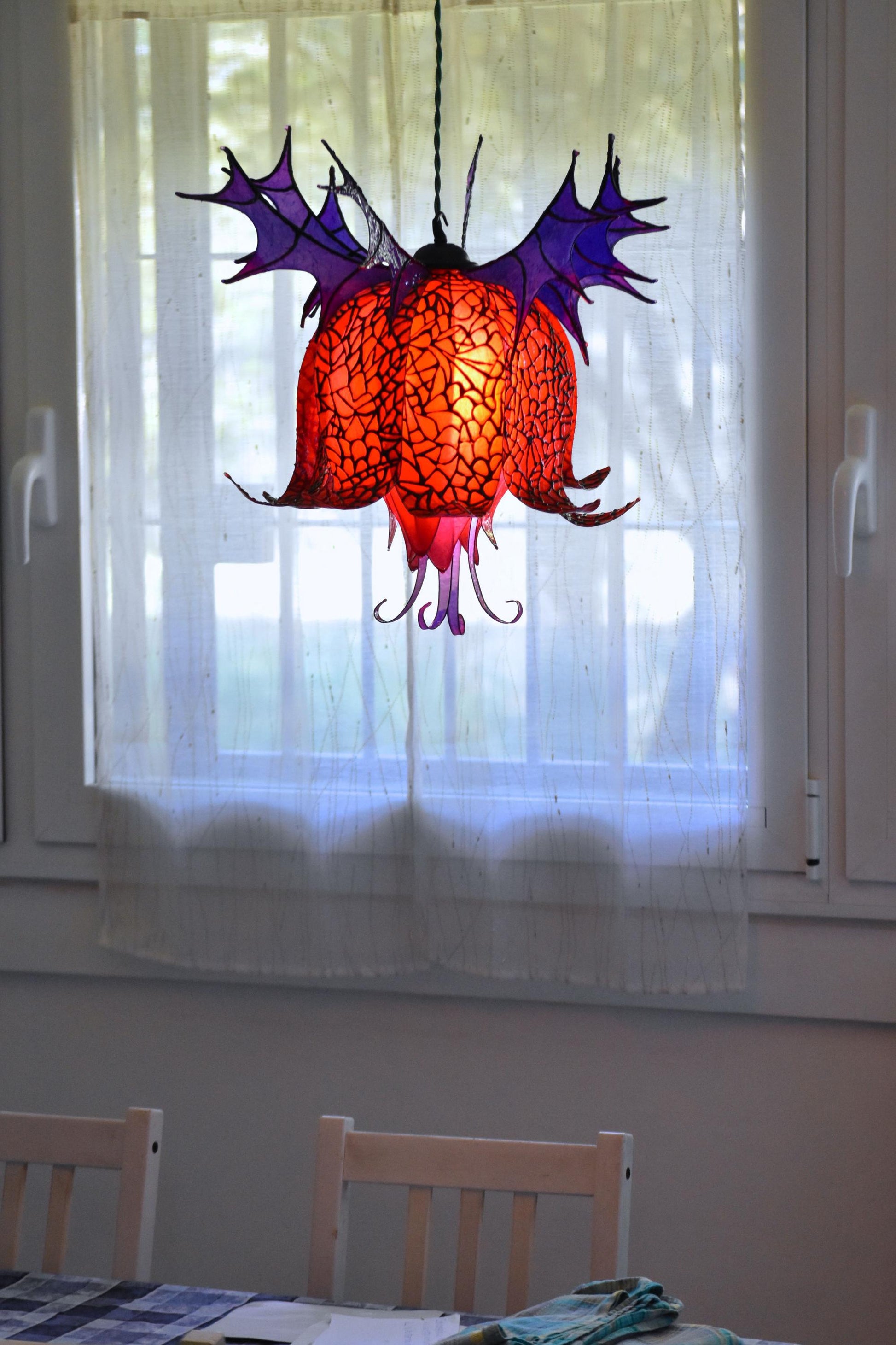 Questa lampada sospesa artigianale, interamente realizzata a mano è un pezzo unico ispirato al mese di Halloween e alle sue atmosfere, ogni petalo è modellato e dipinto a mano con nervature in rilievo di resina traslucida per una realizzazione molto originale!