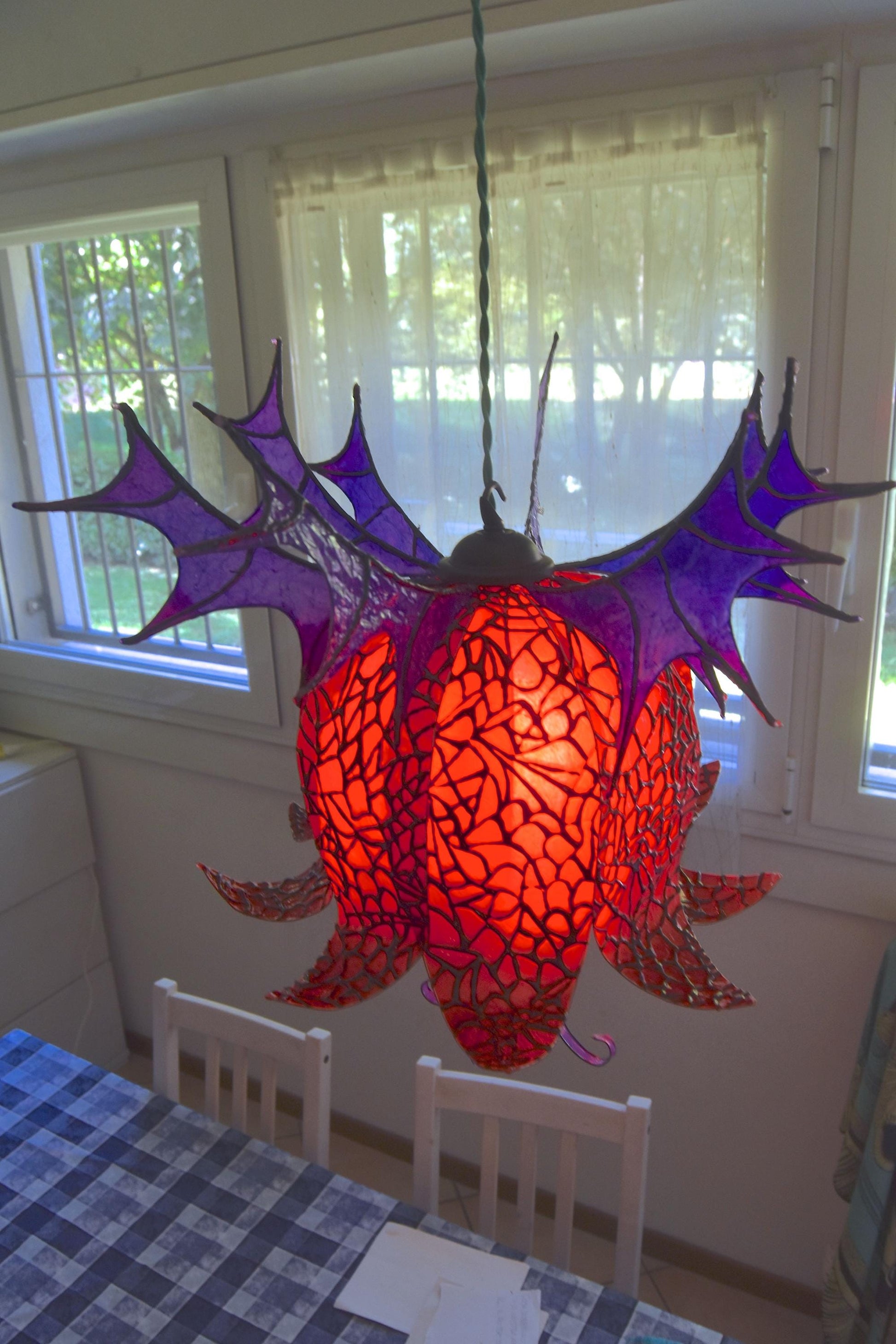 Lampada sospensione motivo pipistrello rosso e viola pezzo unico