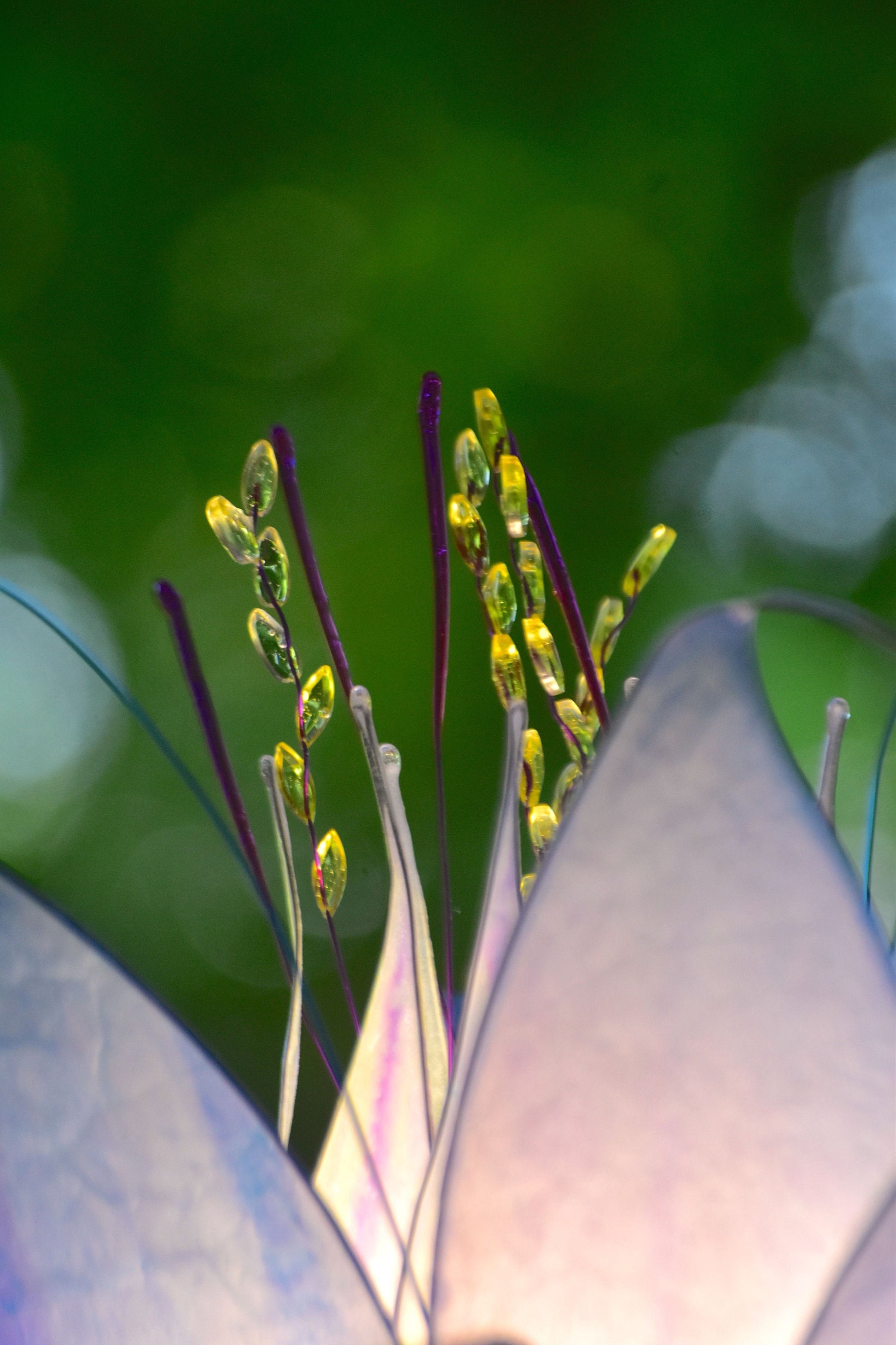 I petali sono realizzati in resina su base di carta dipinta a mano da me, montati su telai di filo di acciaio e composti in forma di fiore, i pistilli, sia interni che quelli sottili intorno al fiore, sono realizzati sempre a mano da me con filo metallico e resina, il fiore si monta su questo semplice stelo che inviero' smontato.